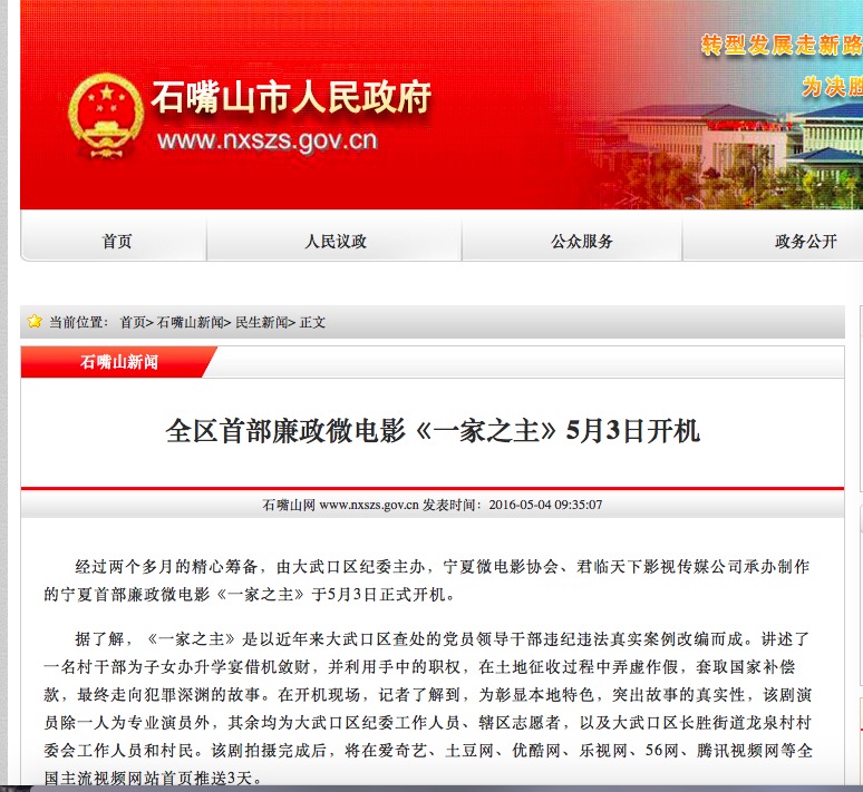 中國影視娛樂訊:2016年05月03日,由石嘴山市大武口區(qū)紀(jì)委、寧夏回族自治區(qū)微電影協(xié)會聯(lián)合出品,君臨天下影業(yè)攝制的寧夏紀(jì)檢監(jiān)察系統(tǒng)首部廉政微電影《一家之主》開機(jī)儀式在石嘴山市大武口區(qū)紀(jì)委會議室舉行。