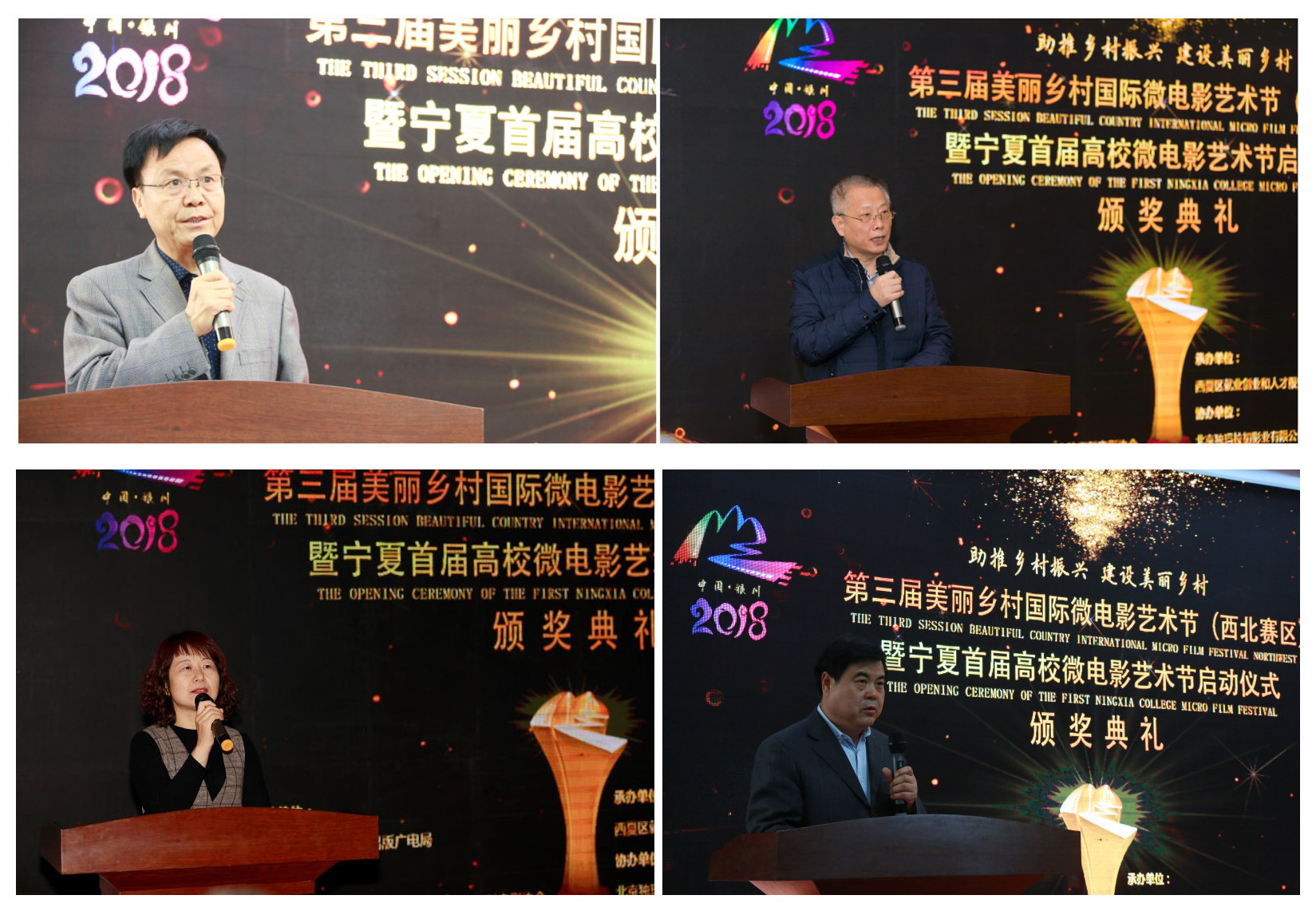 北方民族大學(xué)創(chuàng)新創(chuàng)業(yè)學(xué)院院長(zhǎng)王福平首先致歡迎辭歡迎各界人士的到來;隨后,中國(guó)農(nóng)業(yè)電影電視協(xié)會(huì)副理事長(zhǎng)兼秘書長(zhǎng)張杰、銀川市西夏區(qū)委政法委副書記/西夏區(qū)就業(yè)創(chuàng)業(yè)和人才服務(wù)局局長(zhǎng)李曉穎、寧夏回族自治區(qū)新聞出版廣電局傳媒機(jī)構(gòu)管理與宣傳處處長(zhǎng)/網(wǎng)絡(luò)視聽節(jié)目管理處處長(zhǎng)黨建業(yè)分別在本次微電影藝術(shù)節(jié)上進(jìn)行了致辭,各位領(lǐng)導(dǎo)對(duì)2018美麗鄉(xiāng)村國(guó)際微電影藝術(shù)節(jié)西北賽區(qū)的隆重舉行表示熱烈祝賀與祝福。